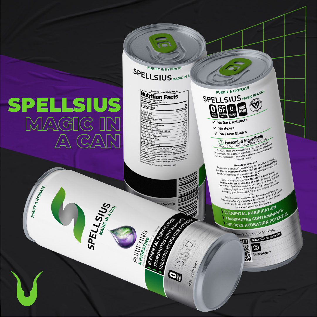 It all started with a silly joke about our professor’s caffeine addiction, and turned into… well, this! I used Adobe Illustrator to design the label for the Spellsius can, drawing inspiration from the well-known energy drink, Celcius, to create a playful parody. After finalizing the design, I used Adobe Photoshop to apply the logos and elements onto a mockup from Unblast, bringing the concept to life in a realistic and eye-catching way. The result is a fun, yet professional take on a fictional product that blends humor with design expertise.